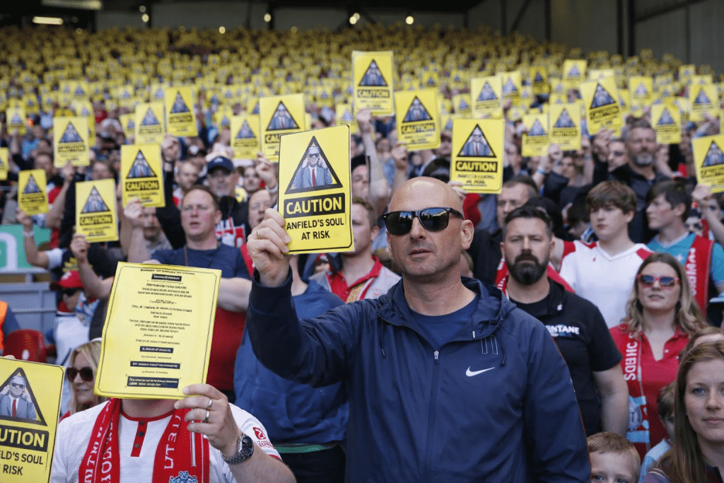 - John W Henry, a tulajdonos volt a szurkolók csalódásának fő tárgya, mivel a felmutatott sárga kártyákon a „Figyelem, Anfield lelke veszélyben van” felirat szerepelt egy képpel az amerikaival.